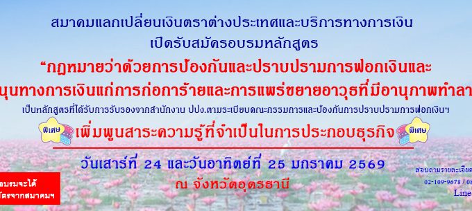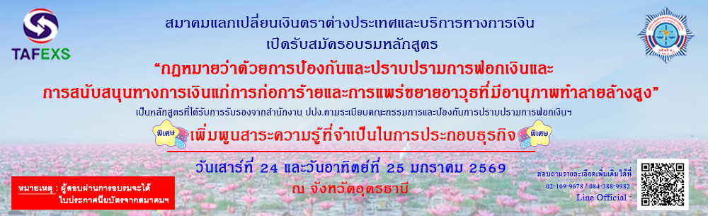 TAFEXS จะจัดฝึกอบรม กฎหมายฟอกเงิน (AML/CFT) รุ่นที่ 10 และเพิ่มพูนสาระความรู้ที่จำเป็นในการประกอบธุรกิจฯ @โรงแรมเดอ ปริ้นเซส อุดรธานี จ. อุดรธานี