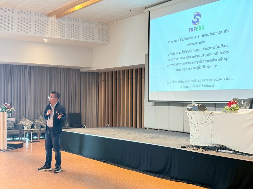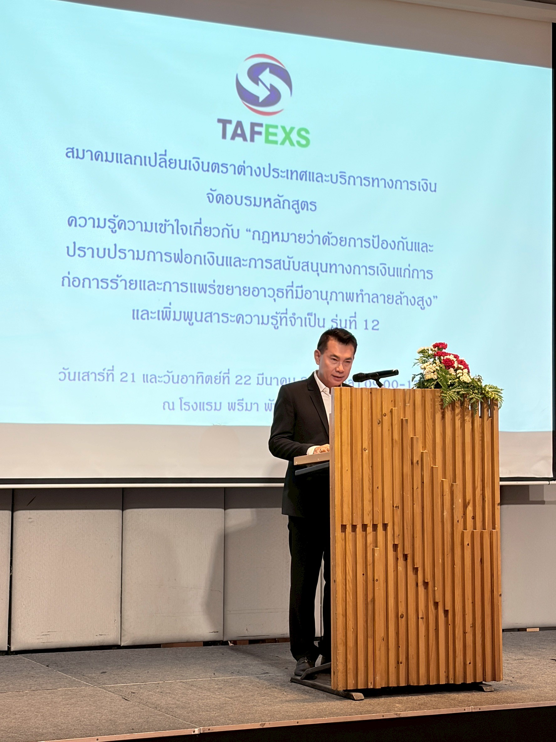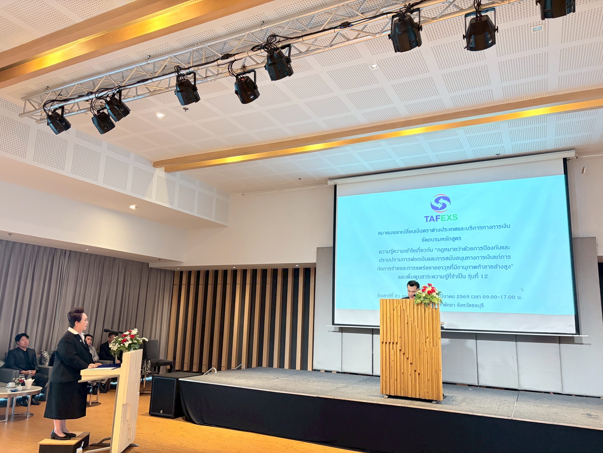 นางสาวชนาพร พูนทรัพย์หิรัญ นายกสมาคมแลกเปลี่ยนเงินตราประเทศและบริการทางการเงิน (TAFEXS) เป็นประธานในการเปิดการอบรมหลักสูตร “กฎหมายการป้องกันการฟอกเงิน (AML/CFT) และเพิ่มพูนความรู้ สำหรับผู้มีหน้าที่รายงานตามกฎหมายว่าด้วยการป้องกันและปราบปรามการฟอกเงินในปฏิบัติหน้าที่อย่างมืออาชีพ รุ่นที่ 12 เมื่อวันเสาร์ที่ 21 และอาทิตย์ที่ 22 มีนาคม 2569 ณ โรงแรม พรีมา พัทยา จังหวัดชลบุรี
